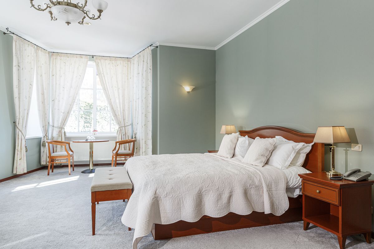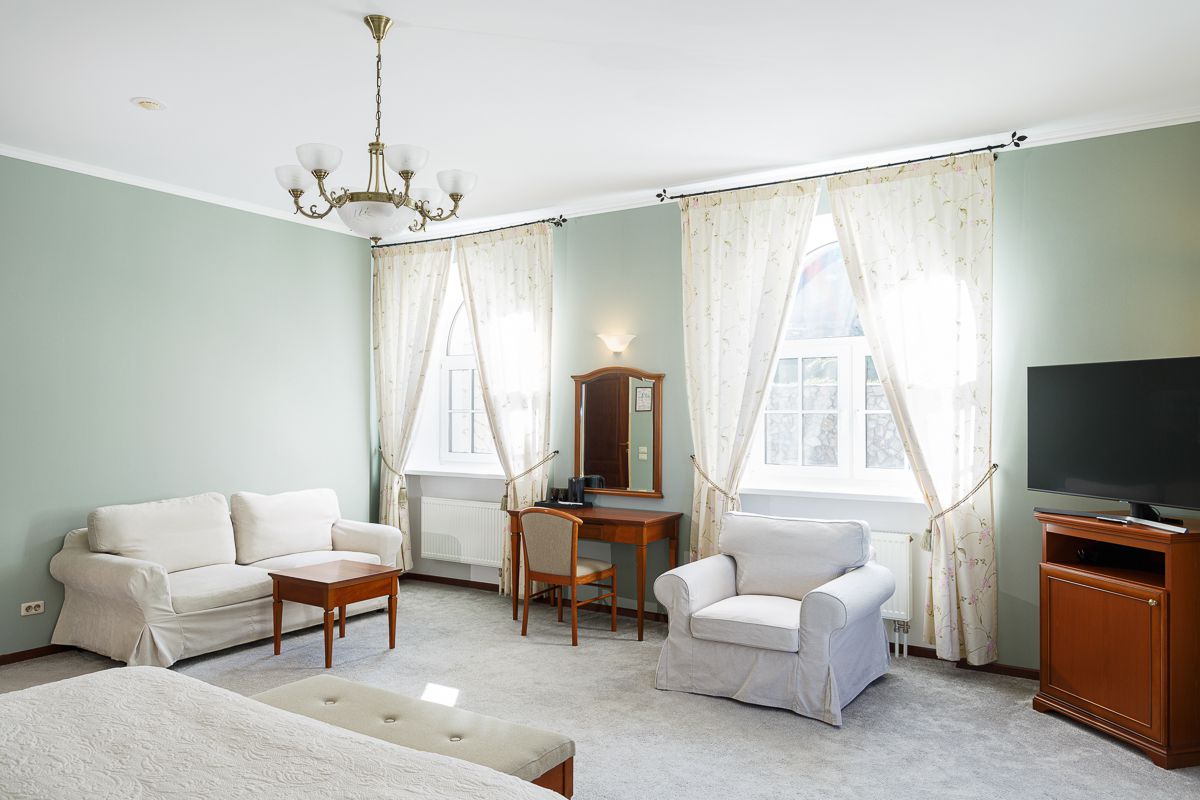Номер состоит из 1 комнаты и санузла с душем. Меблировка: одна двуспальная кровать, кресло и диван. В номере есть телевизор, сейф, мини-бар, телефон, фен.