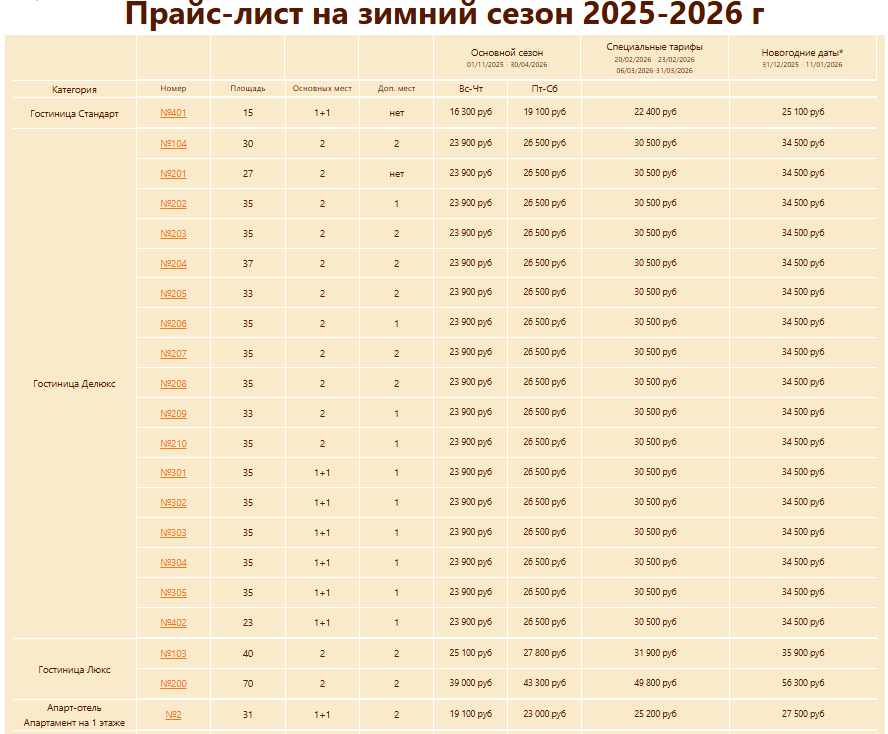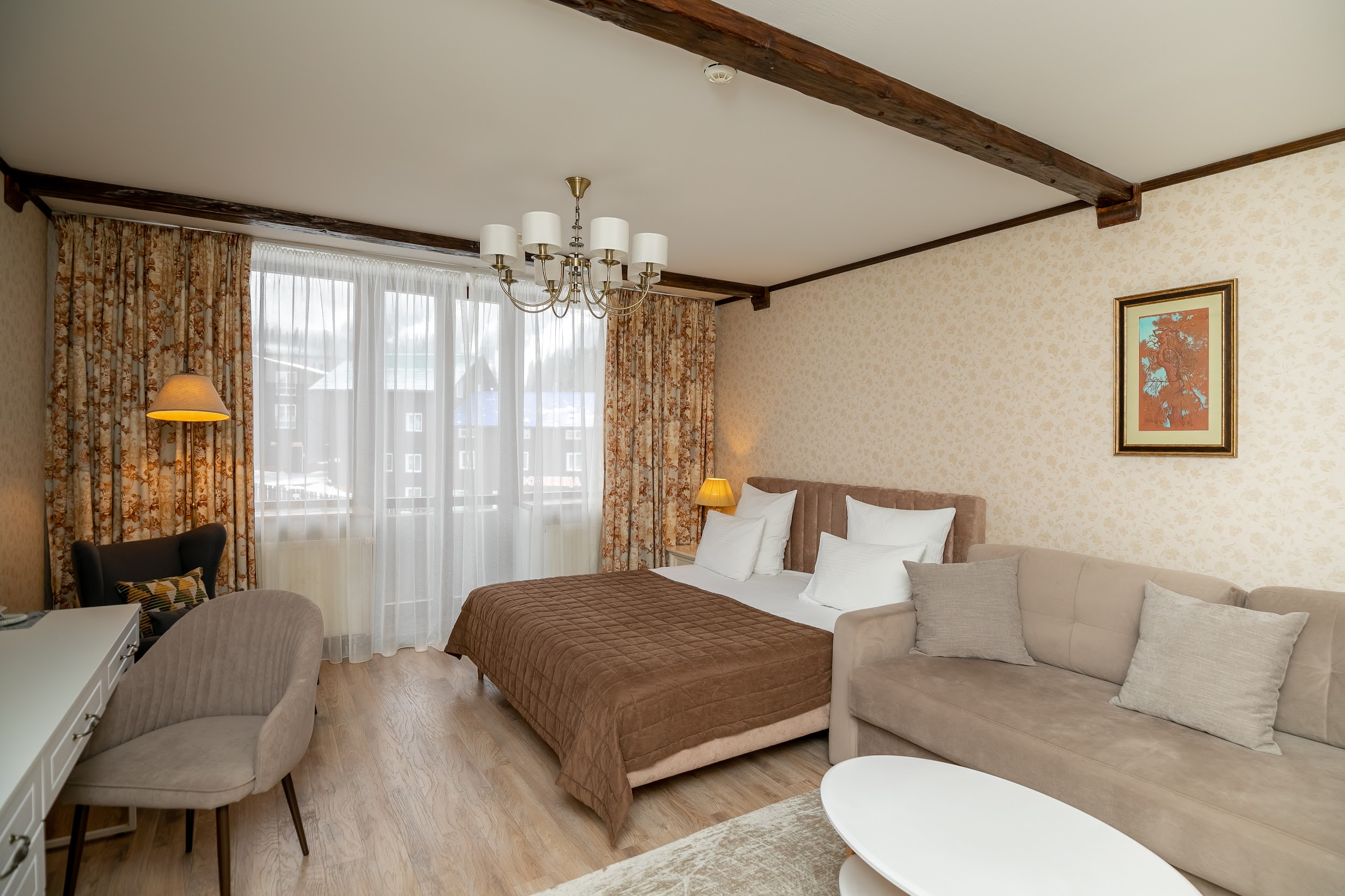 Забота о клиентах будет окружать вас каждое мгновение, проведенное в гостиницы: ее удобное расположение сэкономит ваше время и силы, так необходимые при катании на сложных трассах; ортопедические матрасы, персональные косметические средства и мини-бар подарят чувство комфорта и элитарности, а целый комплекс парных, включающий несколько видов саун и бассейн, вернет вам бодрость и силы.