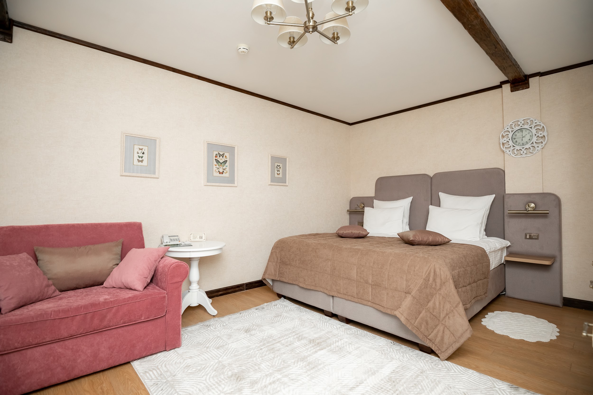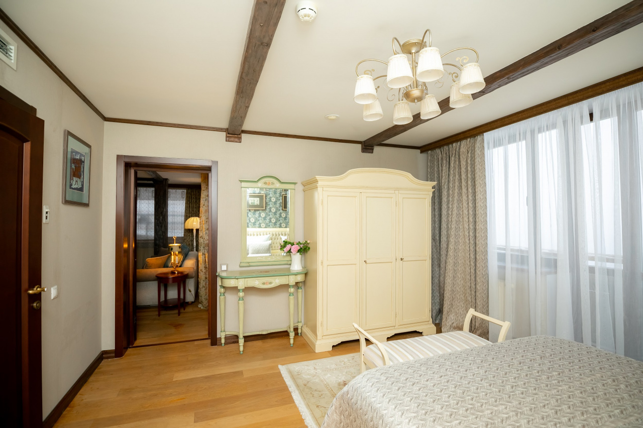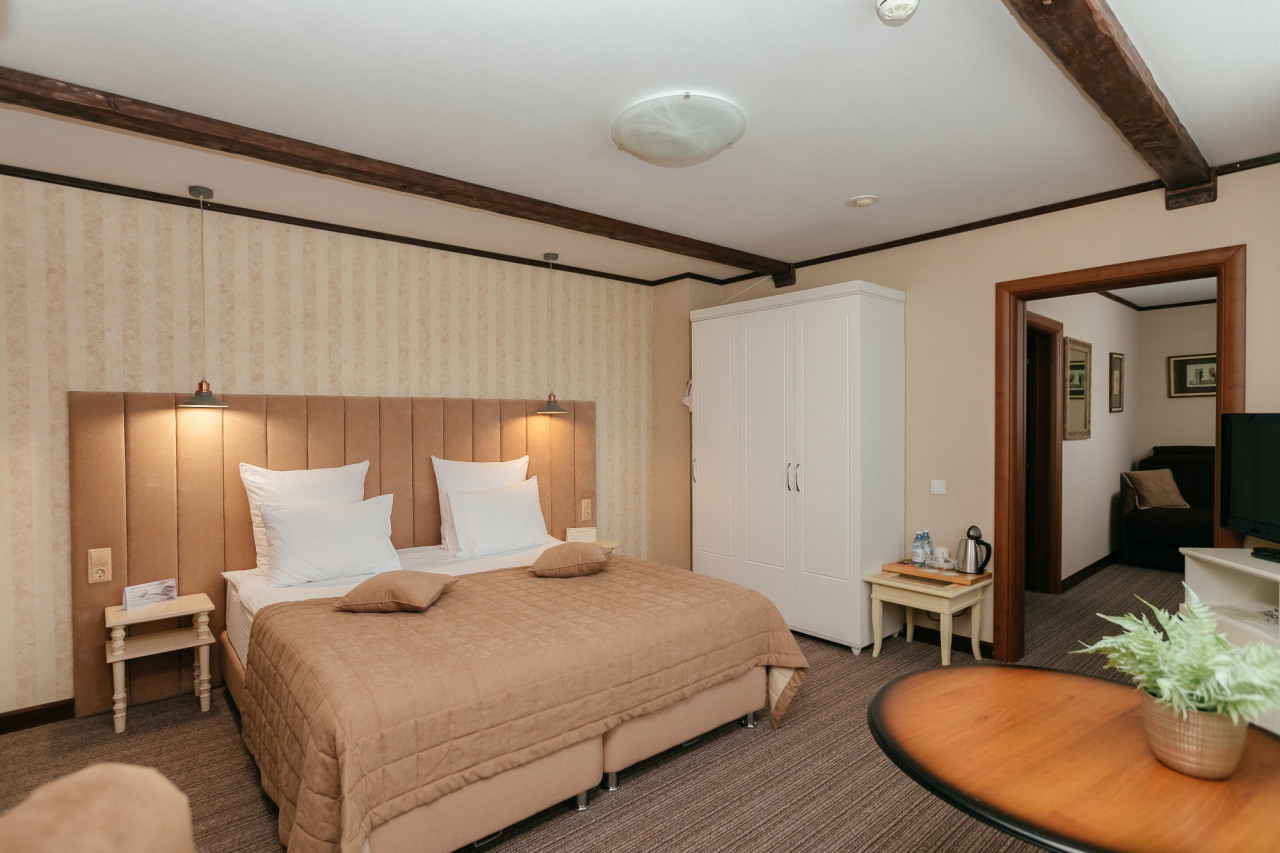 Двухкомнатный номер. В спальне: двуспальная кровать, комод, зеркало. В гостиной: раскладной диван, кресло, журнальный столик, тумба, комод, мини бар (заполняемость мини бара не входит в стоимость номера, приобретается за отдельную плату), чайная станция и питьевая вода 1 бут. для каждого гостя, телевизор. 2 основных места/ 2 дополнительных места (предоставляются на раскладном диване).