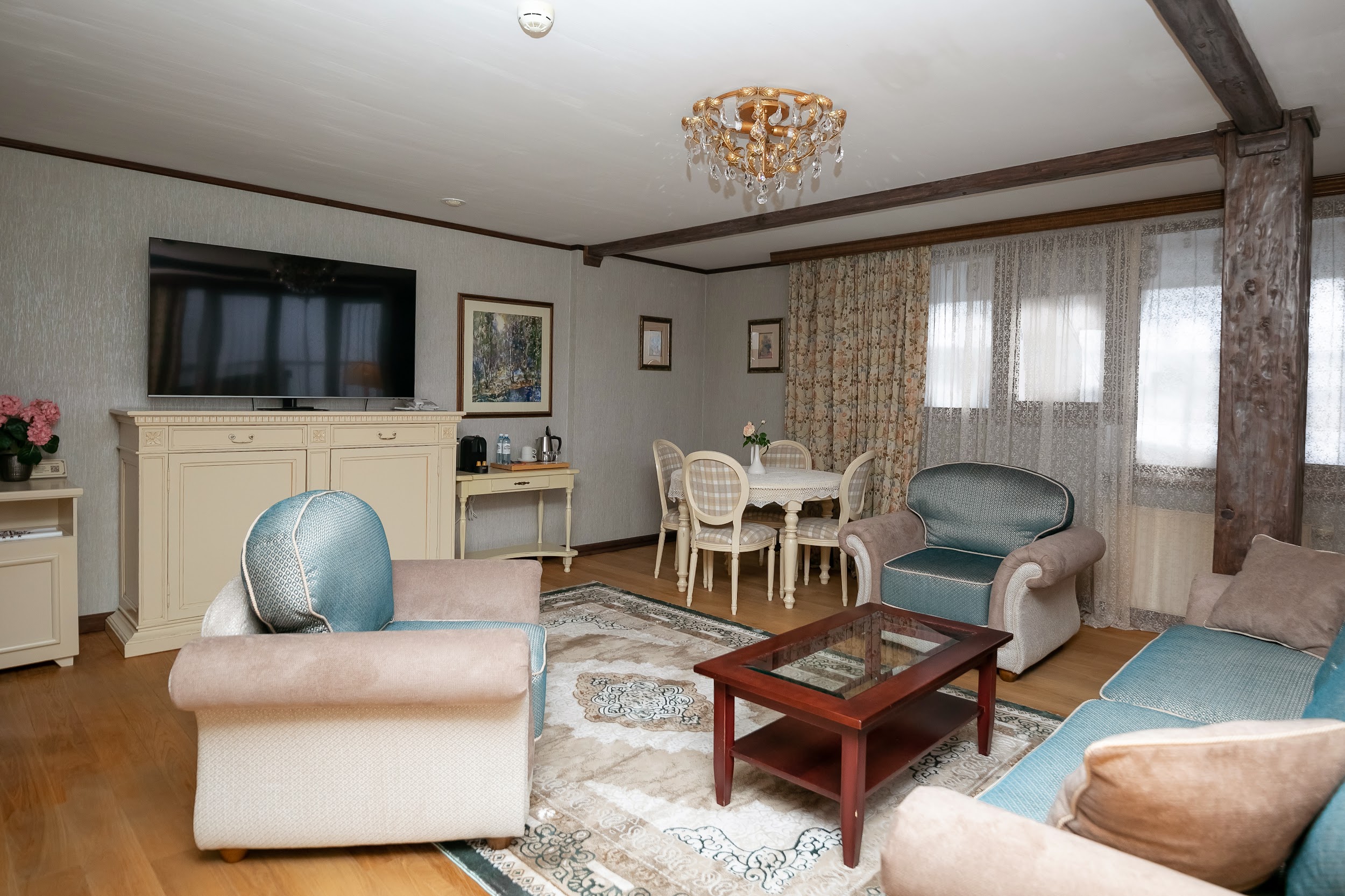 Двухкомнатный номер. В спальне: двуспальная кровать, прикроватные тумбы, платяной шкаф, туалетный столик, зеркало. В гостиной: раскладной диван, два кресла, журнальный столик, сервант, обеденный стол, стулья, мини бар (заполняемость мини бара не входит в стоимость номера, приобретается за отдельную плату), чайная станция и питьевая вода 1 бут. для каждого гостя, телевизор. 2 основных места/ 2 дополнительных места (предоставляются на раскладном диване).