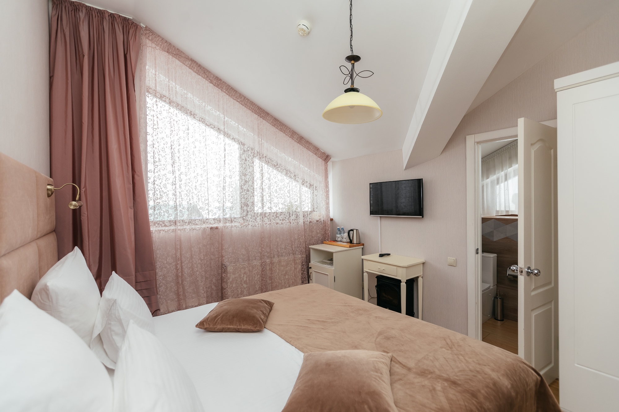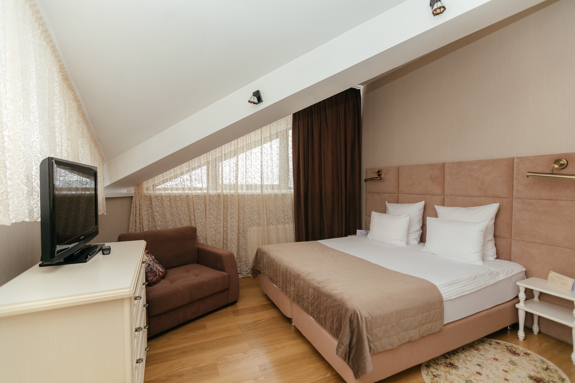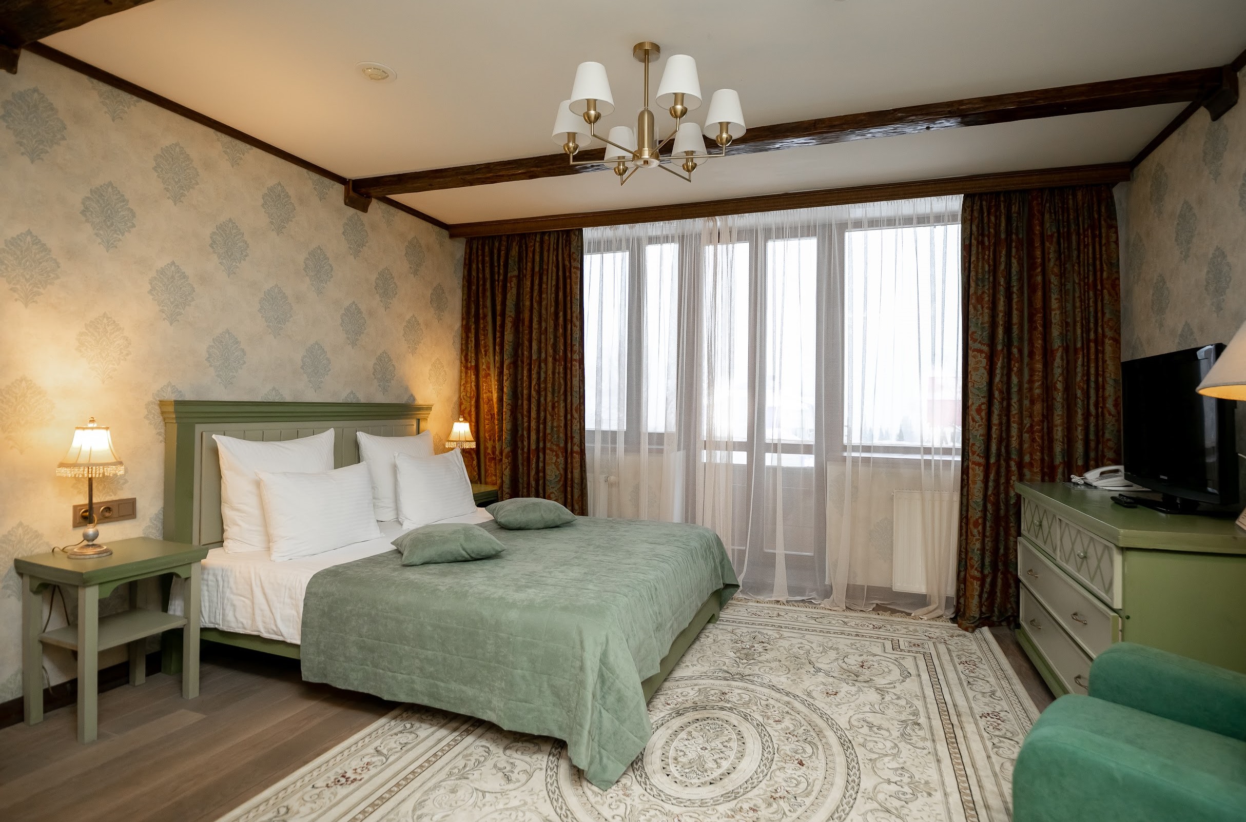 Однокомнатный номер: двуспальная кровать или две односпальные кровати, прикроватная тумба, два кресла, платяной шкаф, журнальный столик, тумба, стол, стул, мини бар (заполняемость мини бара не входит в стоимость номера, приобретается за отдельную плату), чайная станция и питьевая вода 1 бут. для каждого гостя, телевизор. 2 (1+1) основных мест/ 1 дополнительное место (предоставляются на раскладушке).