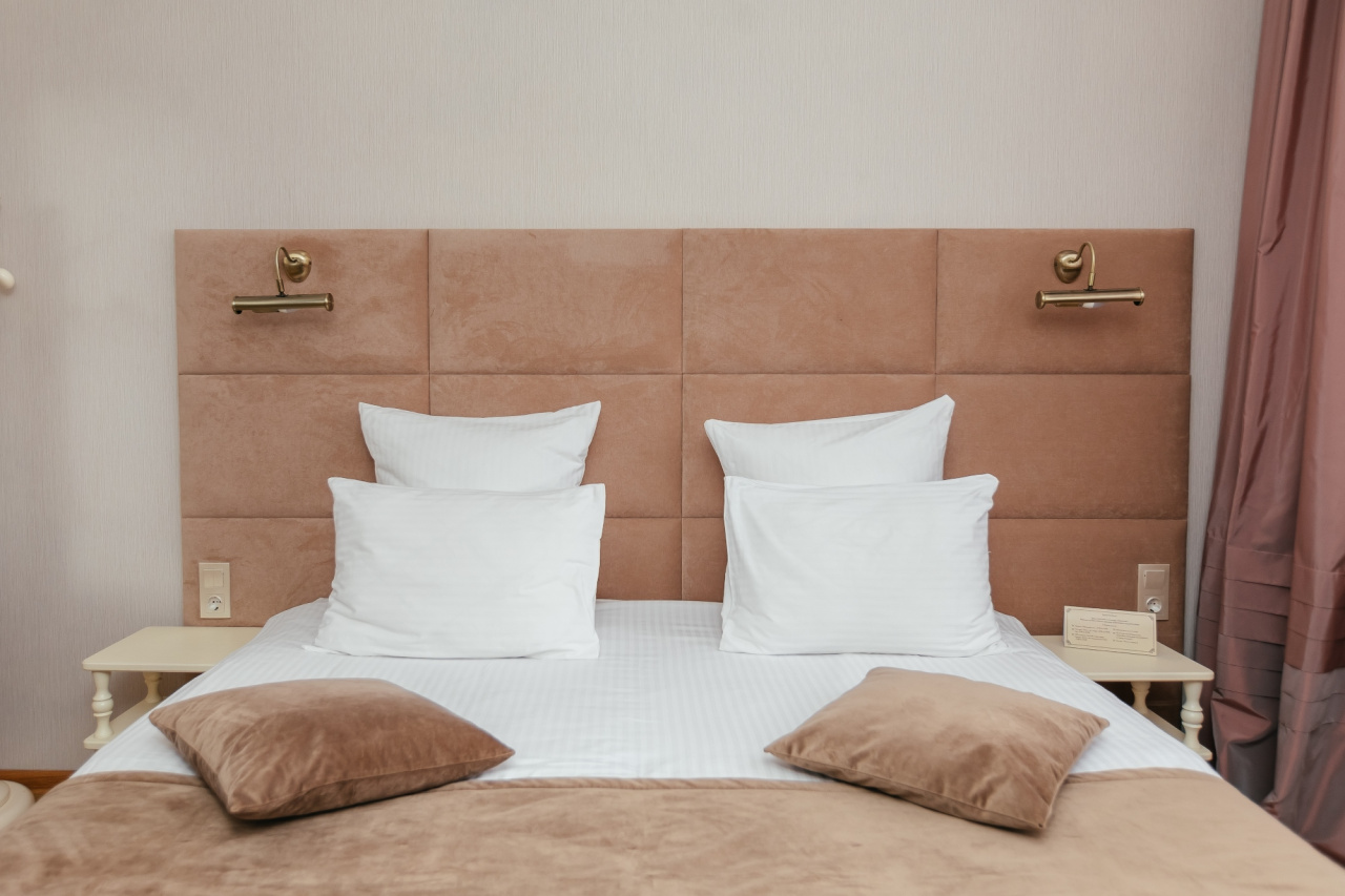 Однокомнатный номер: двуспальная кровать, прикроватные тумбы, журнальный столик, комод, туалетный столик с зеркалом, кресло, мини бар (заполняемость мини бара не входит в стоимость номера, приобретается за отдельную плату), чайная станция и питьевая вода 1 бут. для каждого гостя, телевизор. 2 основных места / 1 дополнительное место (предоставляется на раскладушке).