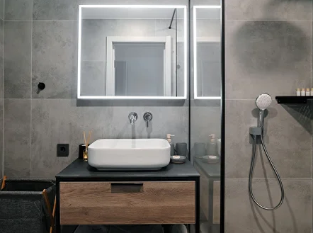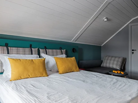 Номер из двух комнат. В спальне: большая двуспальная кровать размера «King size» (кровать может раздвигаться на две односпальные), две прикроватные тумбочки, светильник. В гостиной: раскладывающийся диван, комод, телевизор, журнальный столик, кресло, балкон, душевая комната, туалет, фен, чайник, комплект полотенец, туалетная бумага, жидкое мыло, две бутылки воды. Площадь номера 40-45 м2