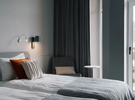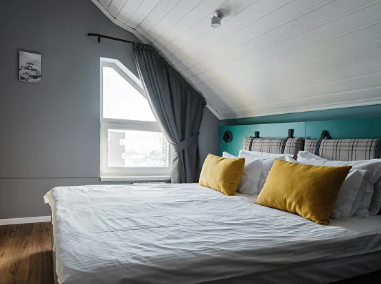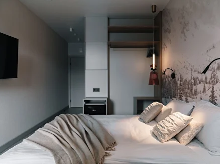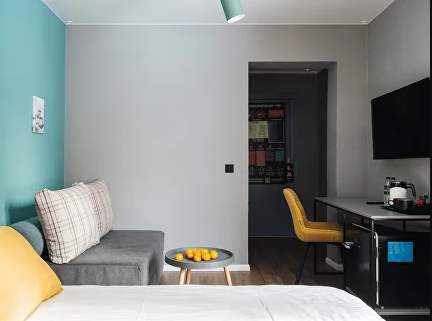 Однокомнатный номер, большая двуспальная кровать размера «King size» (кровать может раздвигаться на две односпальные), в некоторых номерах диван, две прикроватные тумбы, комод, светильник, душ, туалет, фен, постельное белье, полотенец, туалетная бумага, жидкое мыло, две бутылки воды. Площадь номера 15-17 м2