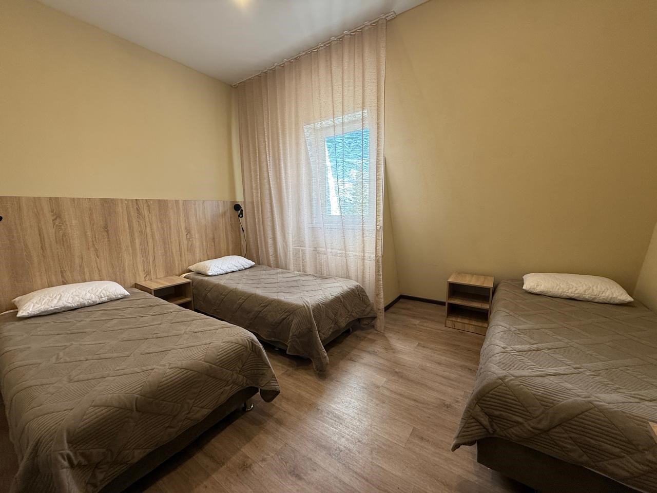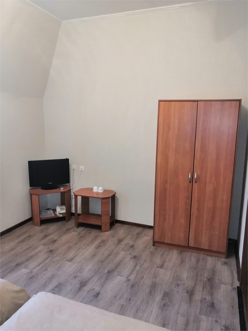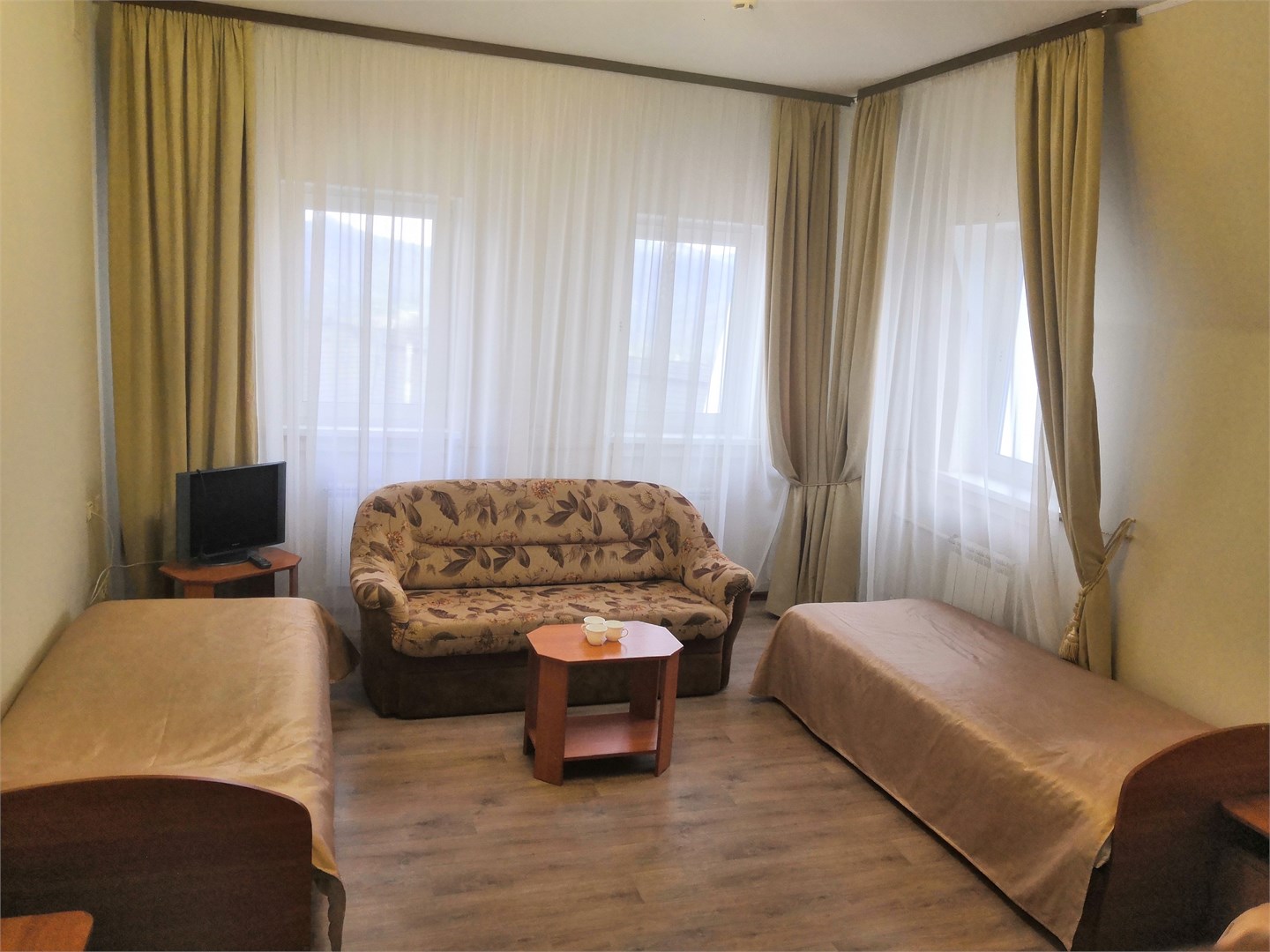 Однокомнатный номер: три односпальные кровати, три прикроватные тумбы, шкаф для одежды, журнальный столик, вешалка, телевизор. Санузел: раковина, унитаз, душевая кабина, зеркало. 1+1+1 основных места/ 0 дополнительных мест.