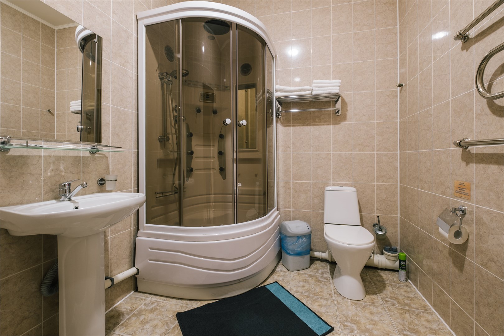Общий санузел на два номера: раковина, унитаз, душевая кабина, зеркало. Фен - по запросу.
