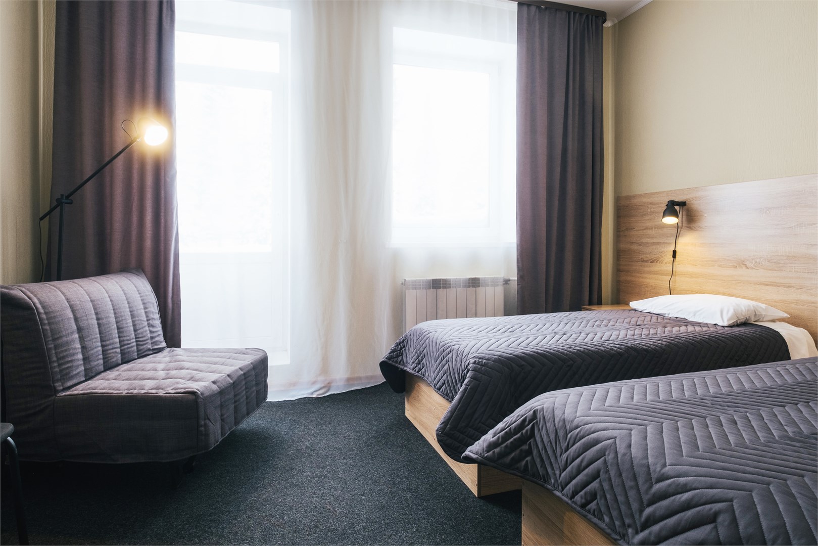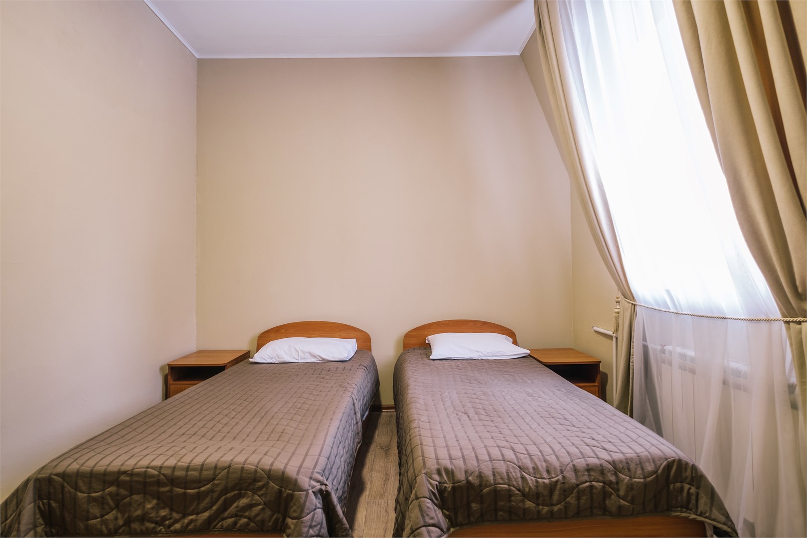 Однокомнатный номер: две односпальные кровати (по просьбе клиента кровати сдвигаются), 2 прикроватные тумбы, шкаф для одежды, журнальный столик, вешалка, телевизор. Санузел: раковина, унитаз, душевая кабина, зеркало. 1+1 основных места/ 0 дополнительных мест.
