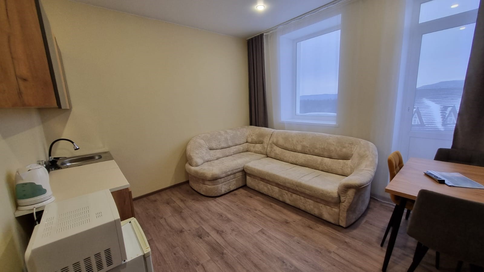 Просторный двухкомнатный номер. Комнаты (спальня и гостиная) соединены аркой, без двери. В номере: двуспальная кровать, 2 прикроватные тумбы, диван, шкаф для одежды, письменный стол, журнальный столик, мини-холодильник, чайник, телевизор. Санузел: раковина, унитаз, душевая кабина, фен. 2 основных/ 2дополнительных места (организуются на раскладном диване за дополнительную плату).