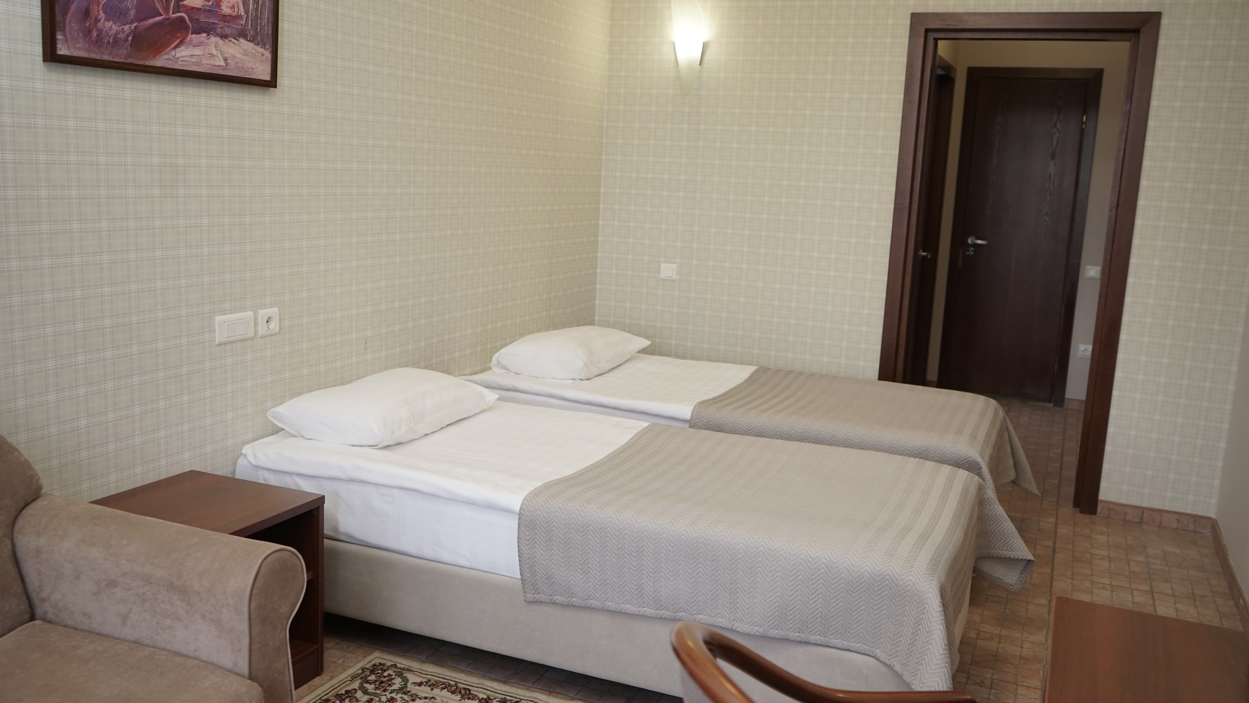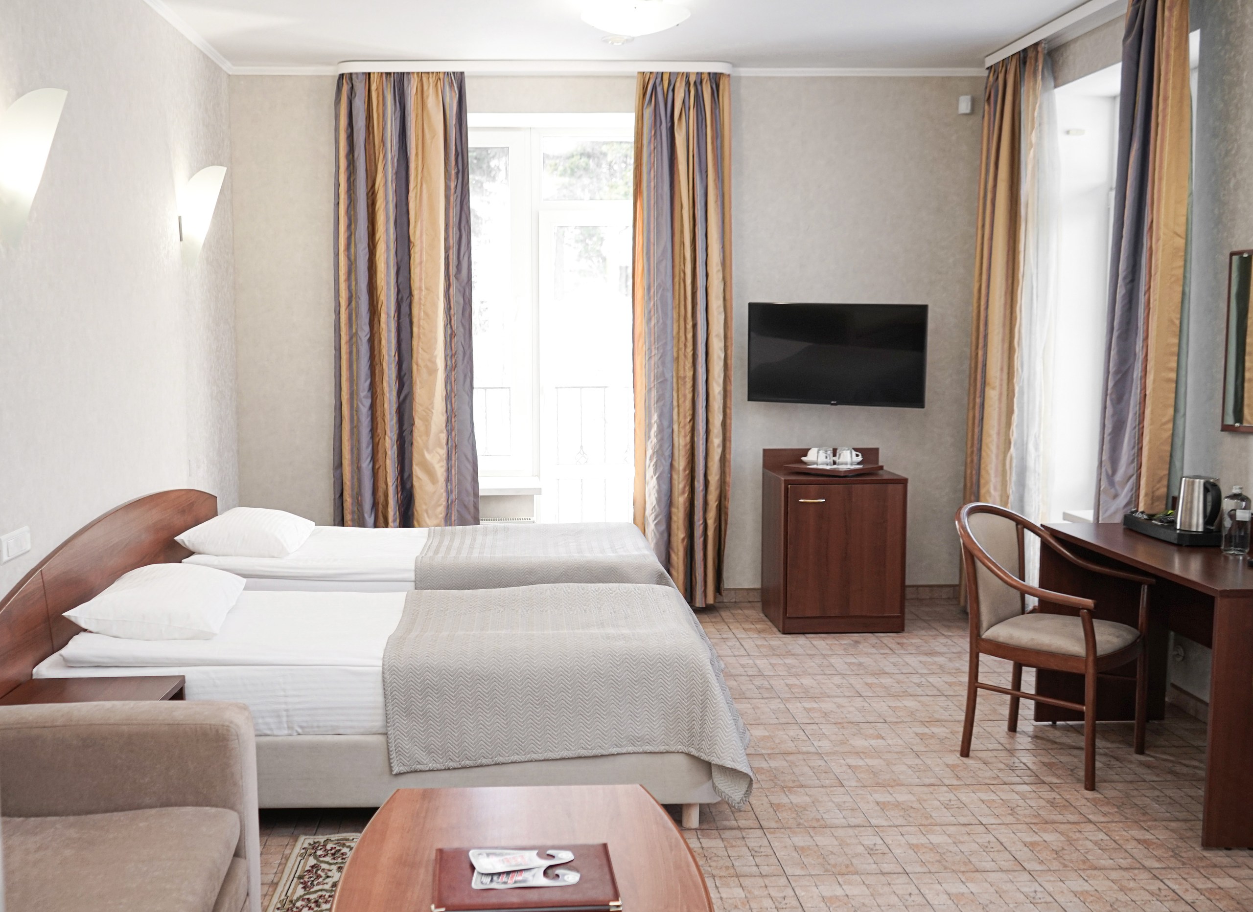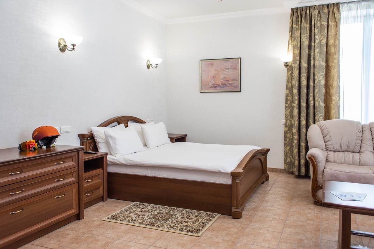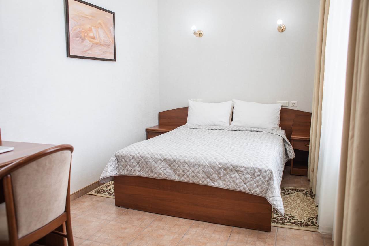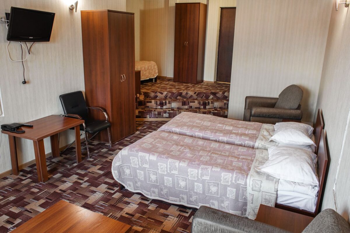 Однокомнатный номер: две односпальные кровати, кресло-кровать, шкаф для одежды, письменный стол, журнальный столик, холодильник, телевизор. Санузел: душ, раковина, зеркало, унитаз, фен, набор средств гигиены. 1+1 основных места / 1 дополнительных места (предоставляются на кресло-кровати).