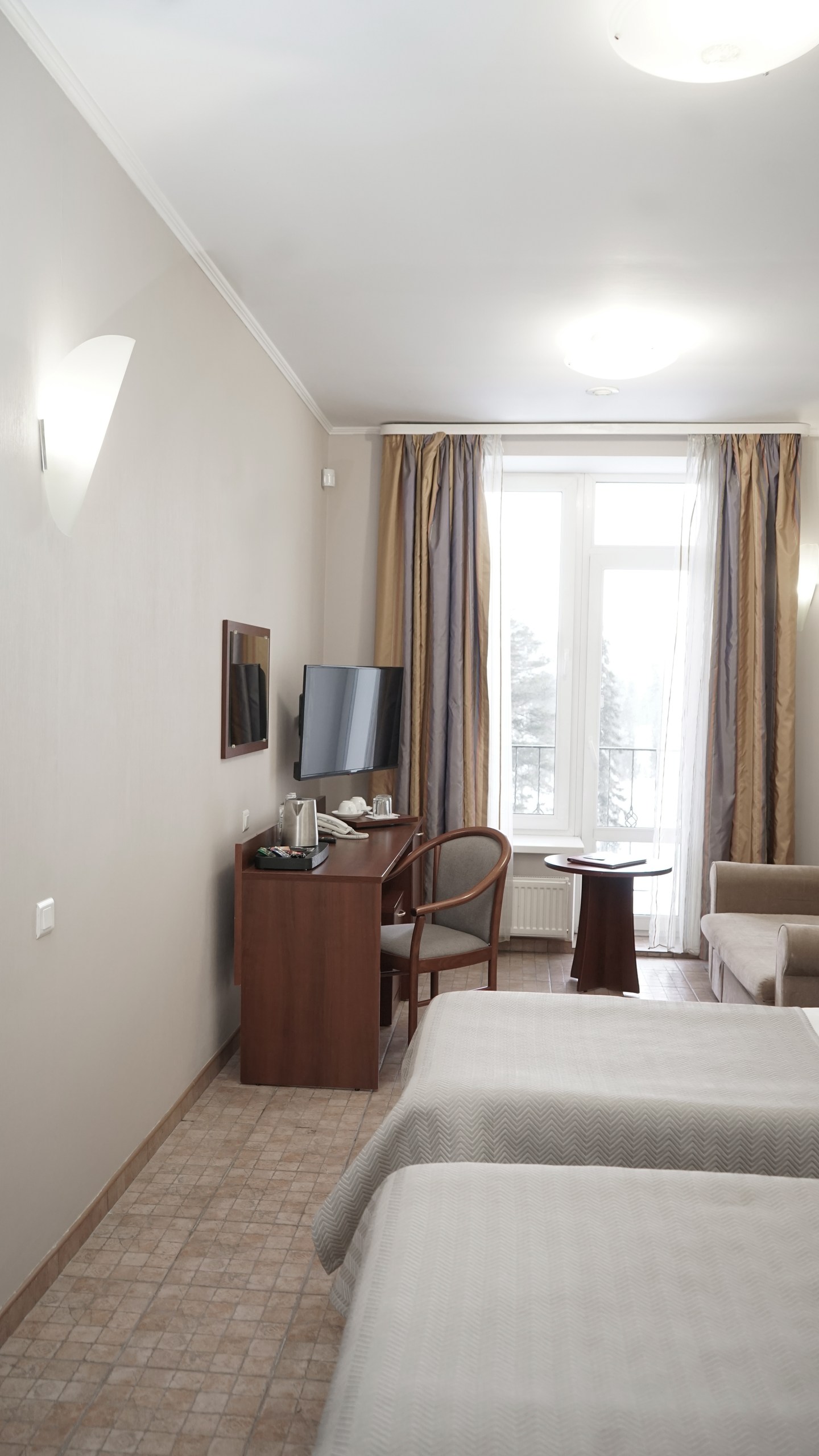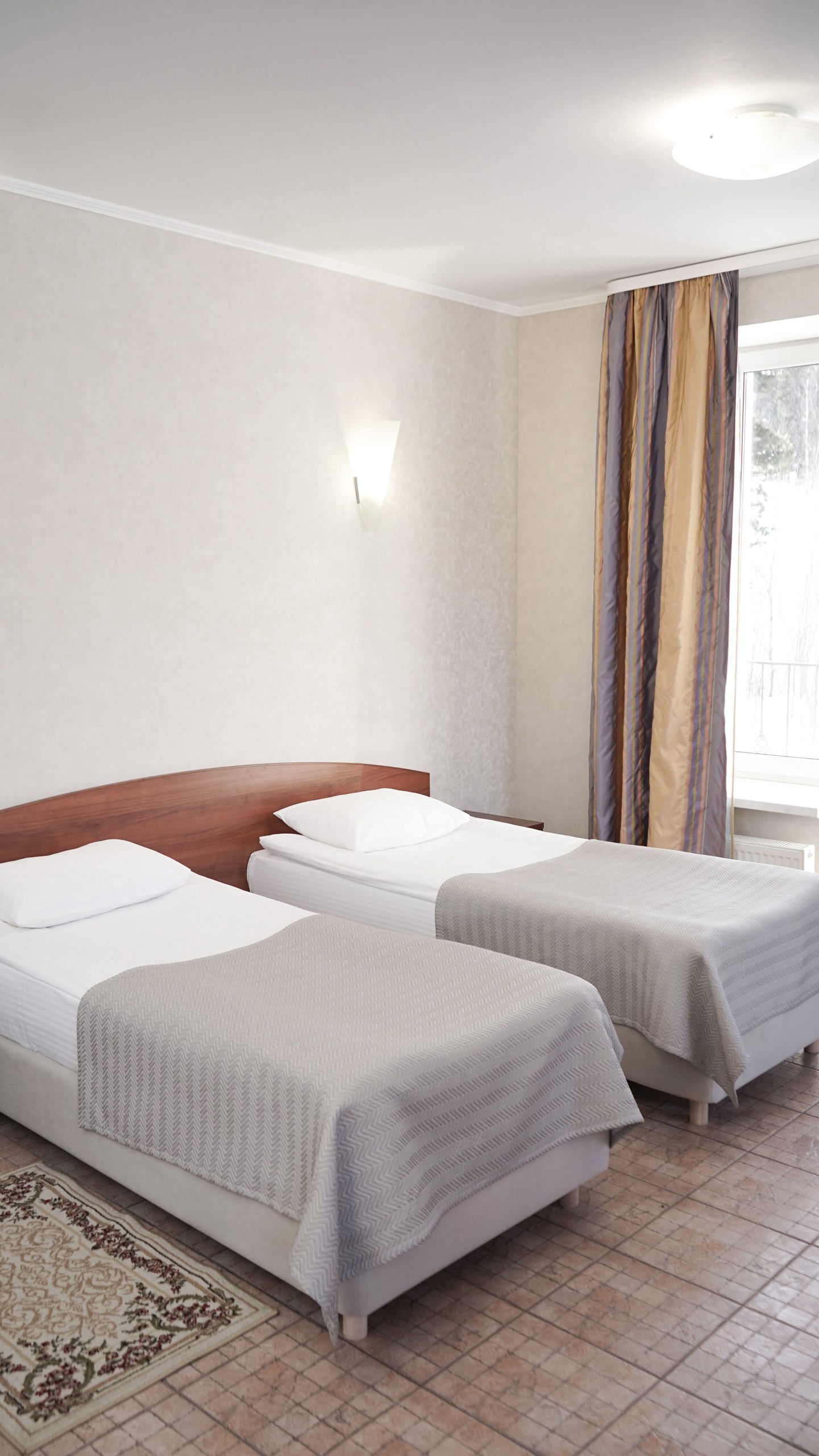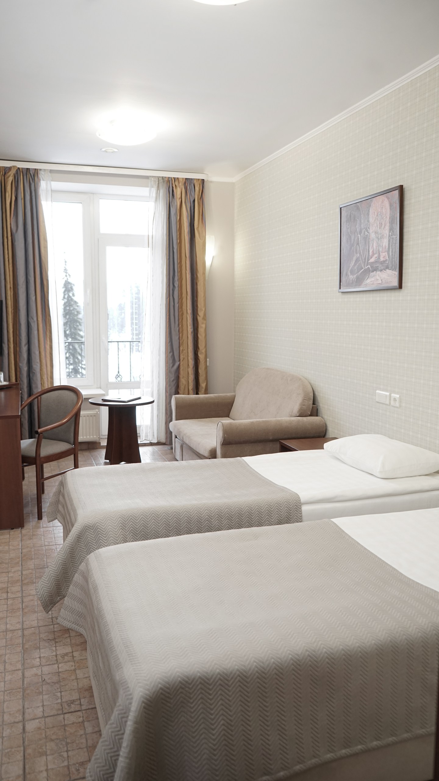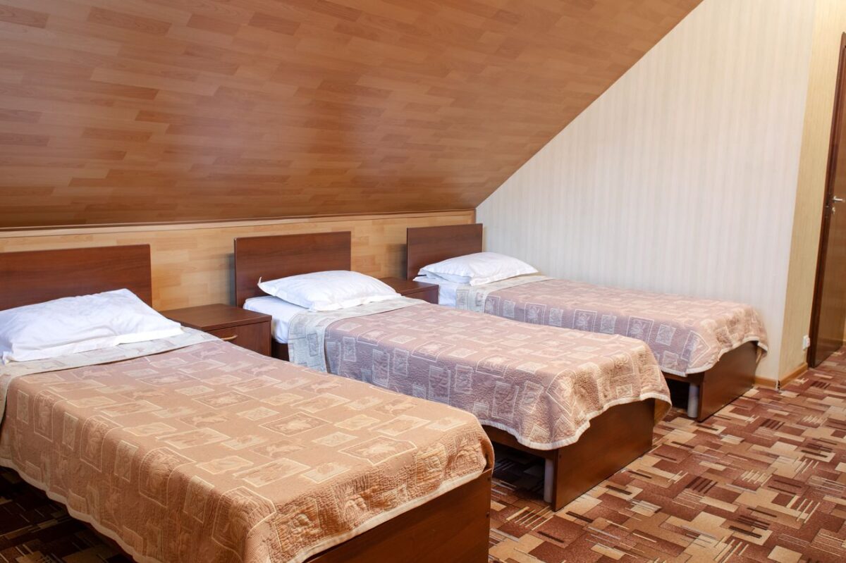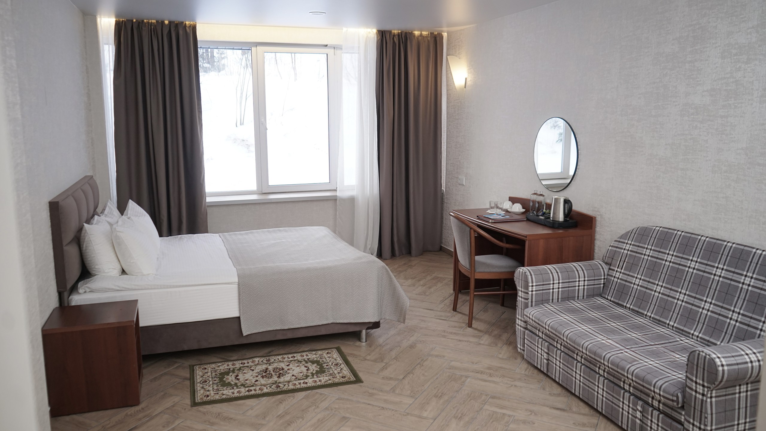 Однокомнатный номер: две односпальные кровати, кресло-кровать, шкаф для одежды, письменный стол, журнальный столик, холодильник, телевизор. Санузел: душ, раковина, зеркало, унитаз, фен, набор средств гигиены. 1+1 основных места / 1 дополнительных места (предоставляются на кресло-кровати).