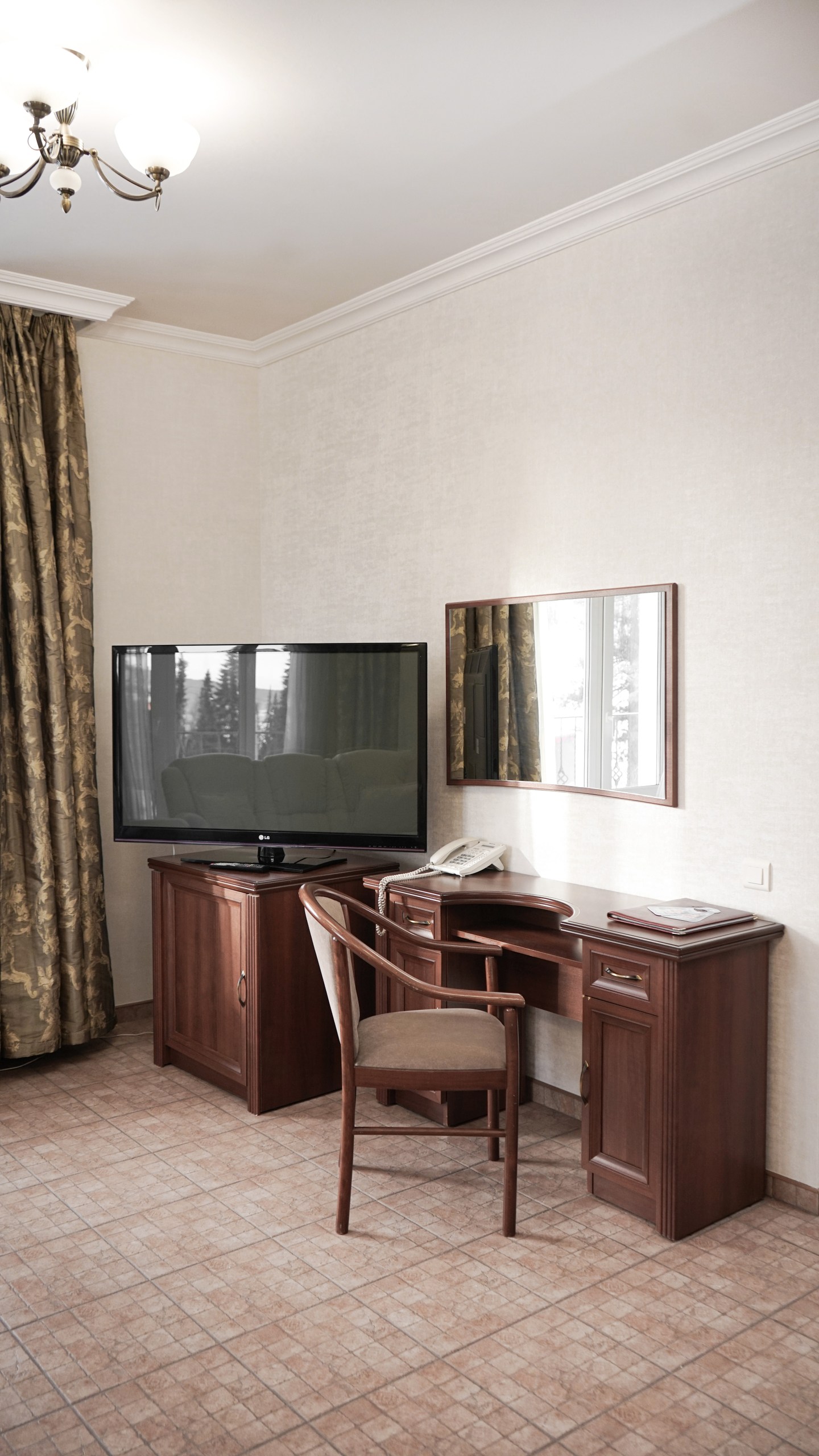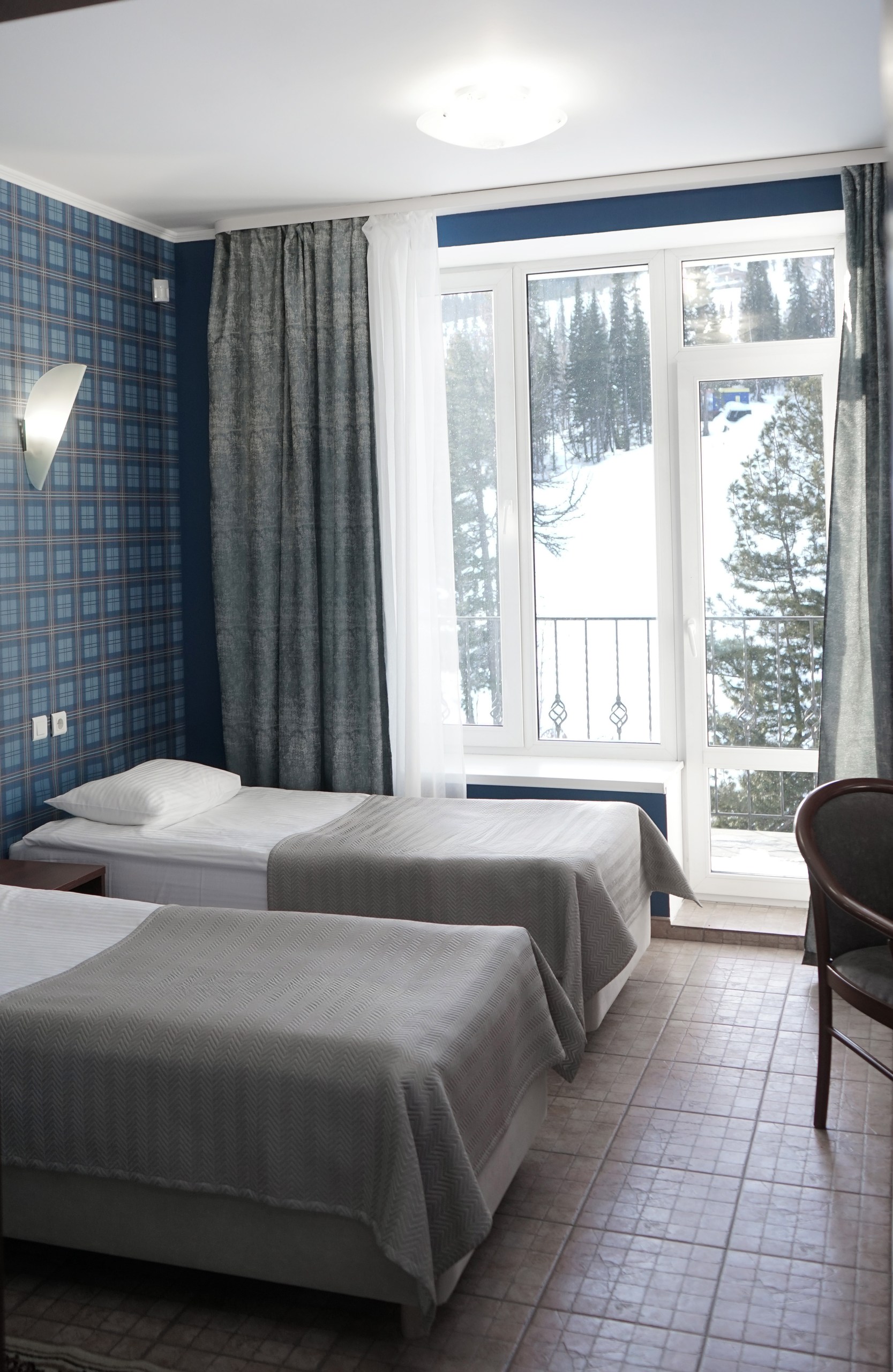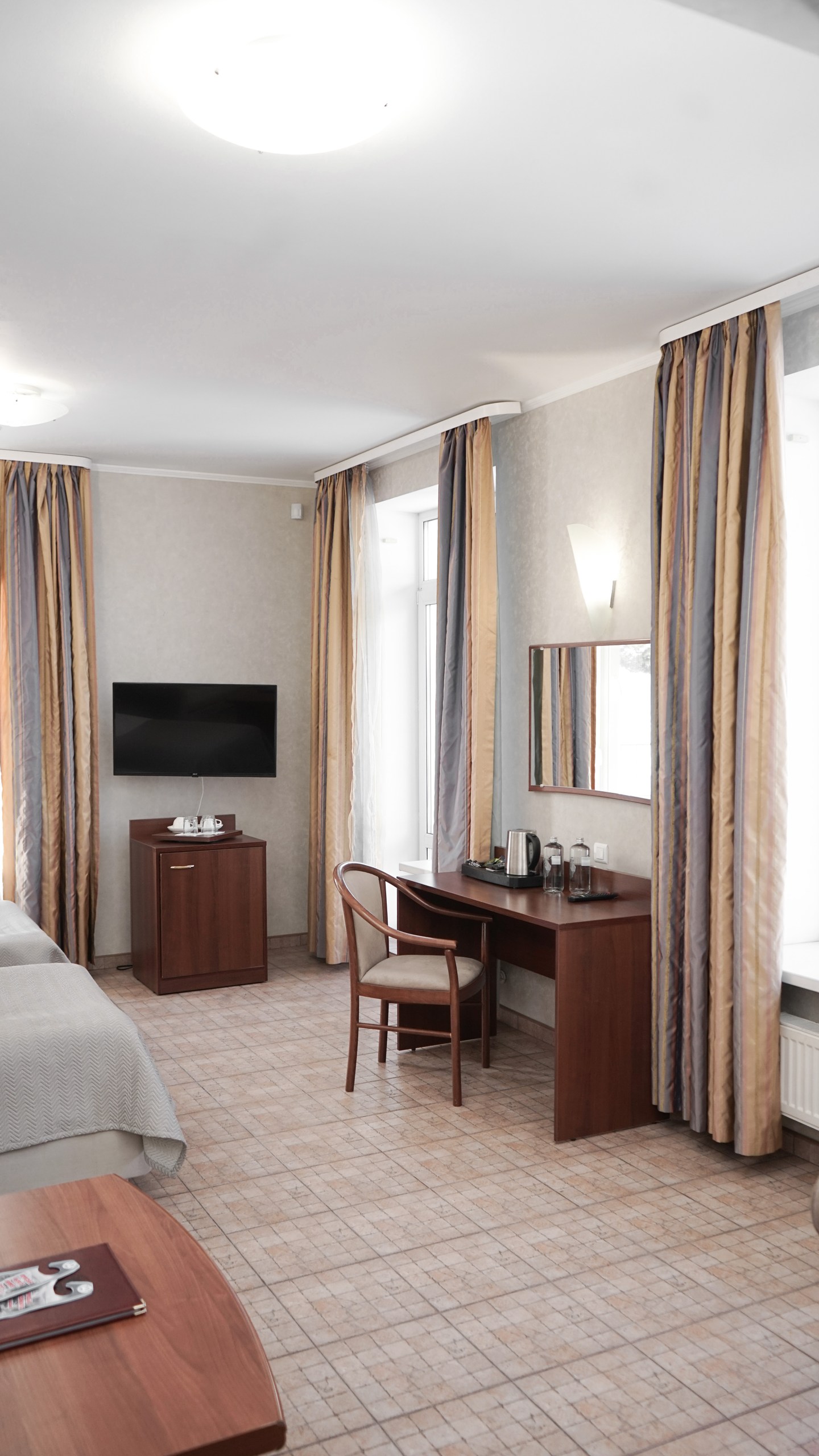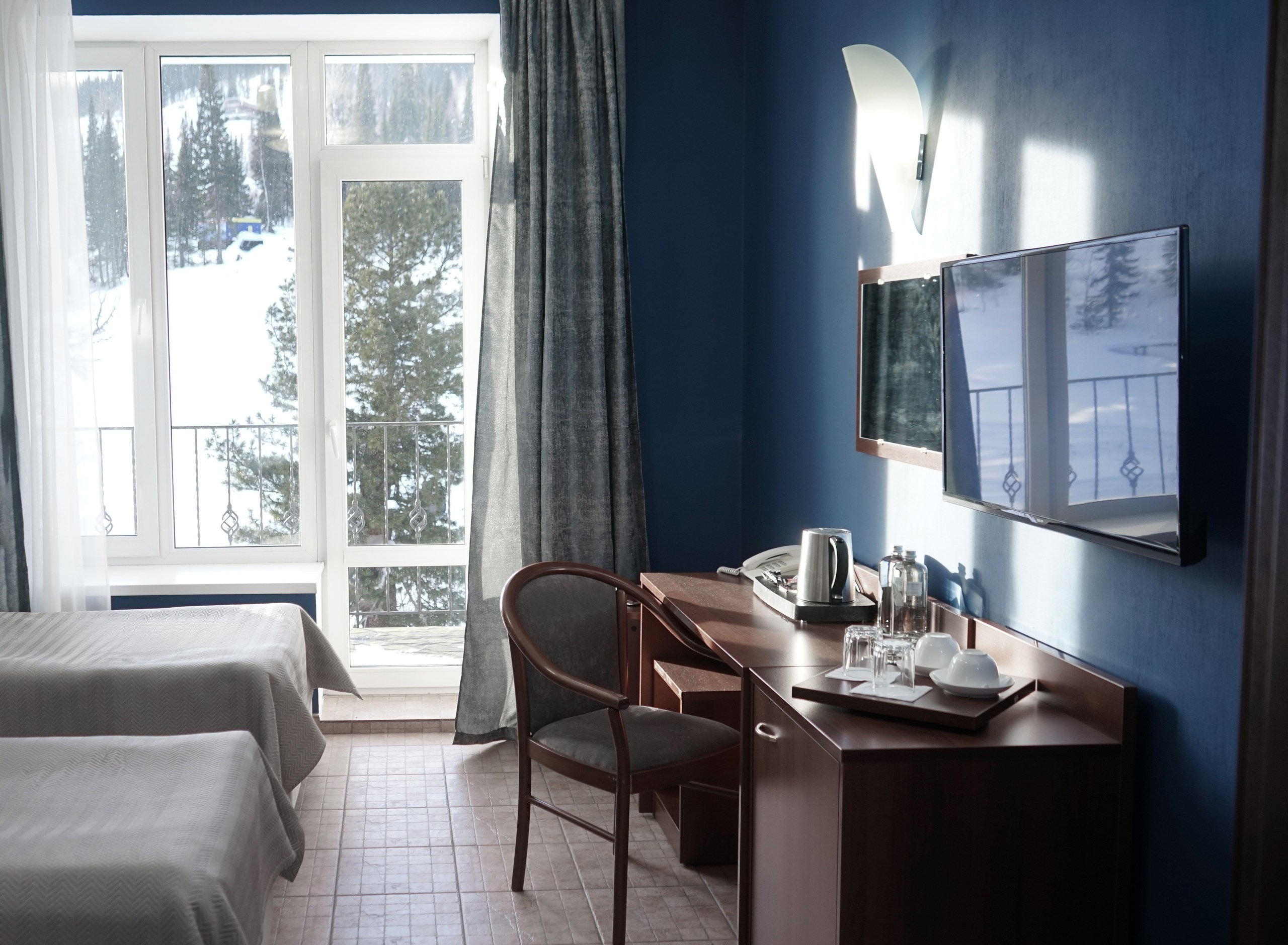 Однокомнатный номер: две односпальные кровати, кресло-кровать, шкаф для одежды, письменный стол, журнальный столик, холодильник, телевизор. Санузел: душ, раковина, зеркало, унитаз, фен, набор средств гигиены. 1+1 основных места / 1 дополнительных места (предоставляются на кресло-кровати).