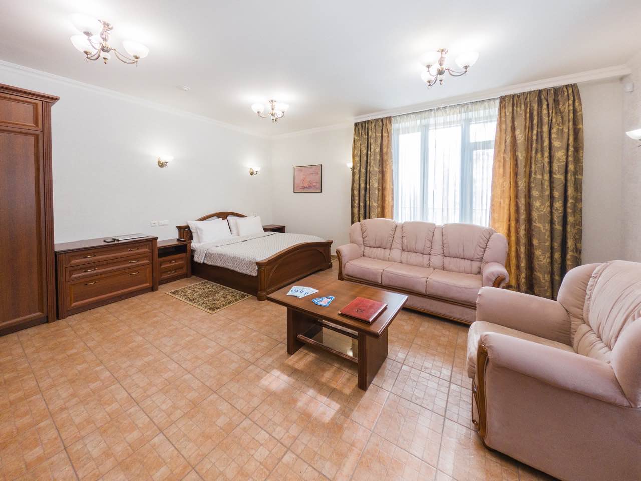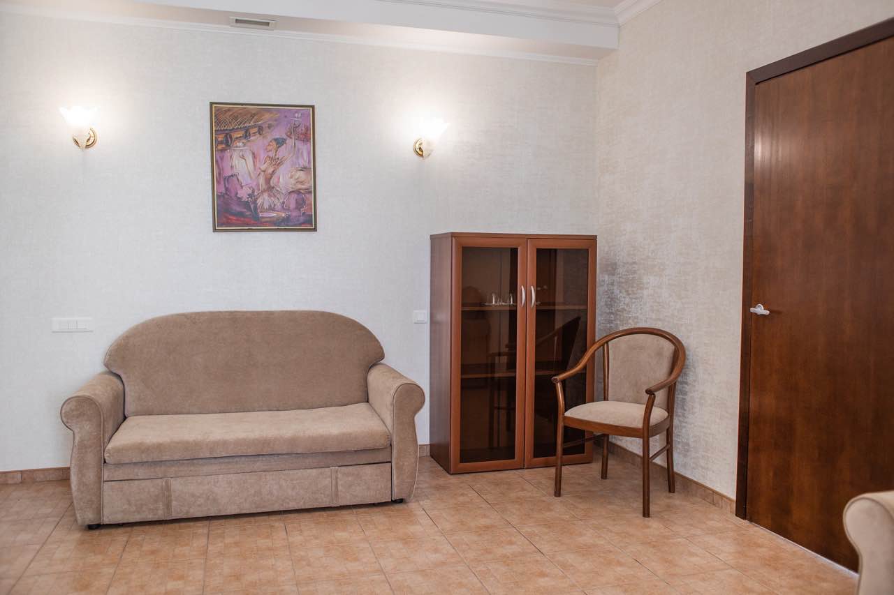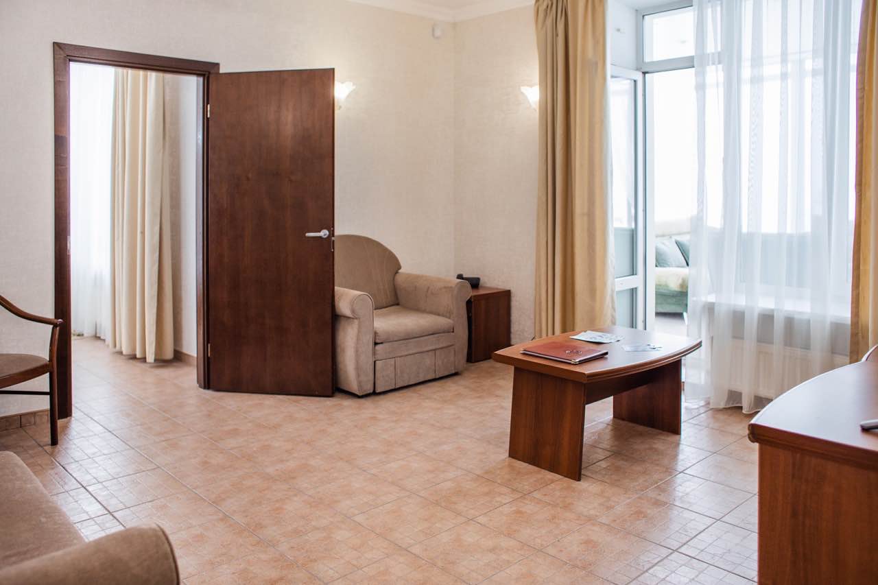 Двухкомнатный номер. В спальне: двуспальная кровать, комод, туалетный столик, письменный стол. В гостиной: диван-кровать, кресло-кровать, шкаф для одежды, обеденный стол, журнальный столик, холодильник, телевизор. Санузел: душ, раковина, зеркало, унитаз, фен, халат, набор средств гигиены. 2+1 основных мест / 2 дополнительных места (предоставляются на диван-кровати и кресло-кровати).
