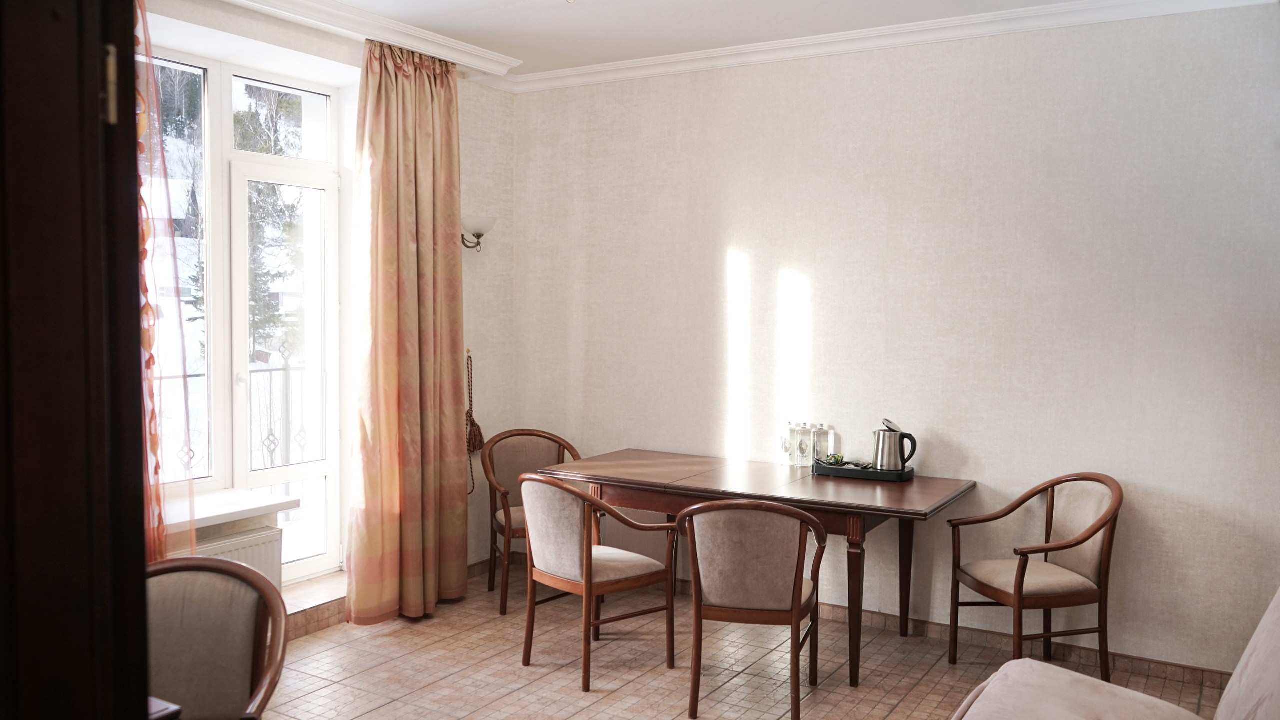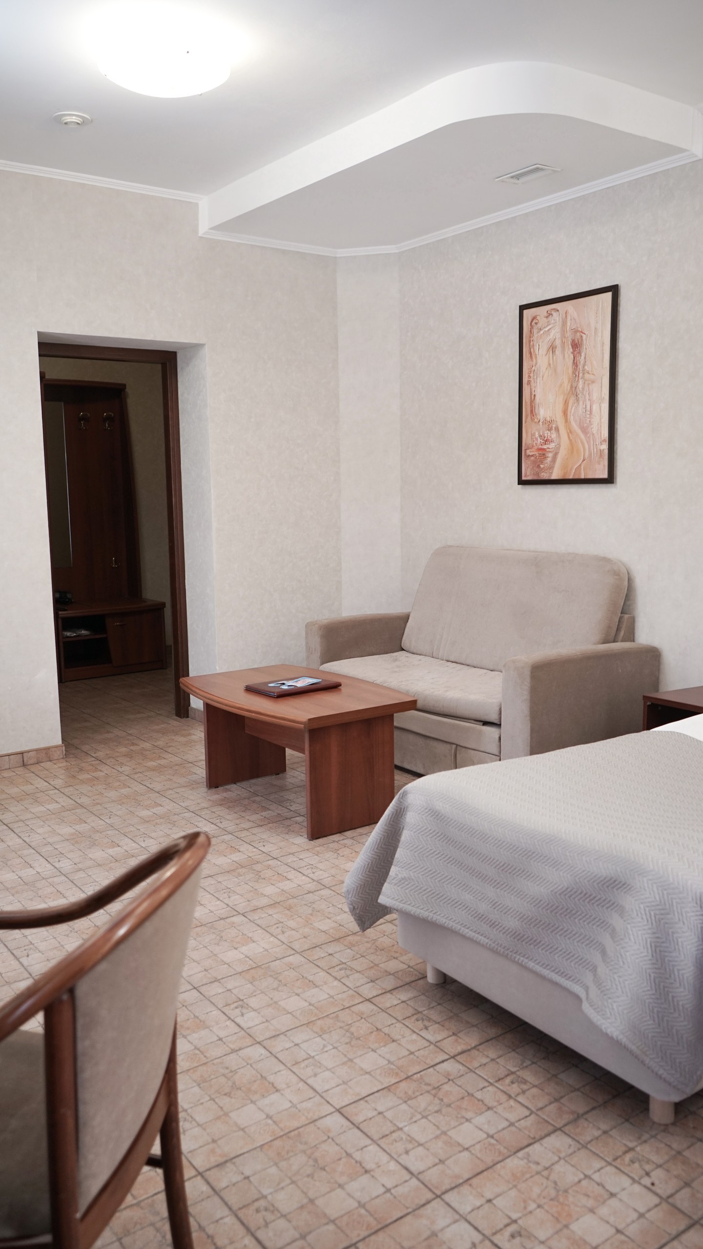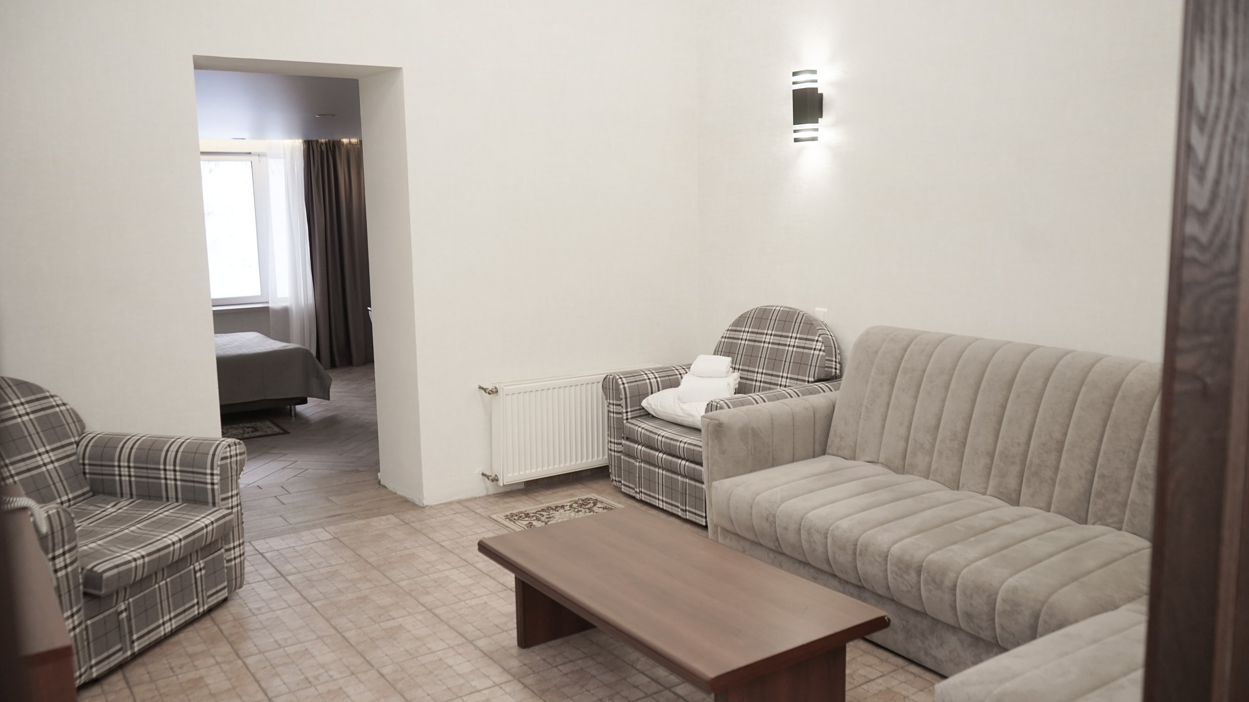 Двухкомнатный номер. В спальне: двуспальная кровать, комод, туалетный столик, письменный стол. В гостиной: диван-кровать, кресло-кровать, шкаф для одежды, обеденный стол, журнальный столик, холодильник, телевизор. Санузел: душ, раковина, зеркало, унитаз, фен, халат, набор средств гигиены. 2+1 основных мест / 2 дополнительных места (предоставляются на диван-кровати и кресло-кровати).