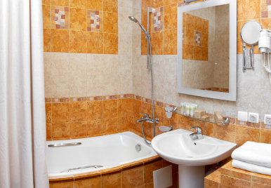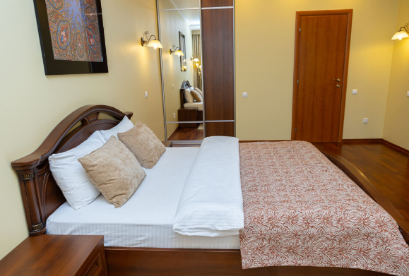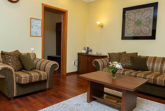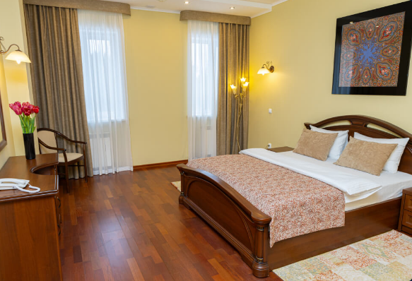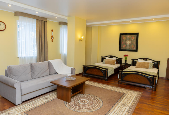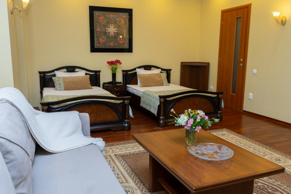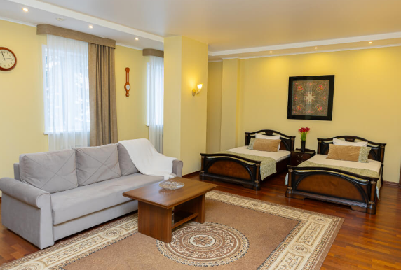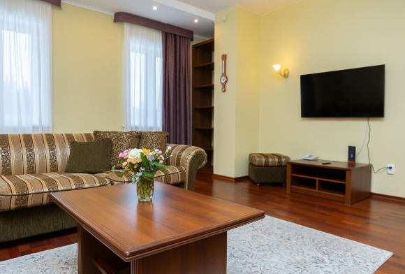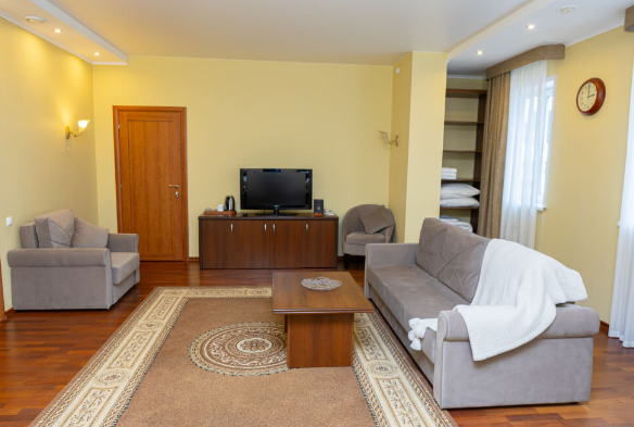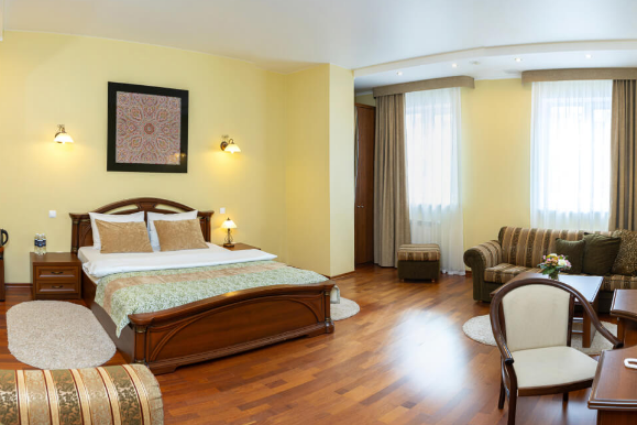 Двухкомнатный номер: состоит из гостиной, спальни, прихожей и комнаты для сушки верхней одежды. Одна двуспальная кровать, диван, эксклюзивная мебель, плазменный телевизор, сейф, холодильник, комфортная зона отдыха. Ванная комната с ванной и биде (2 места + 1 ребенок до 14 лет).